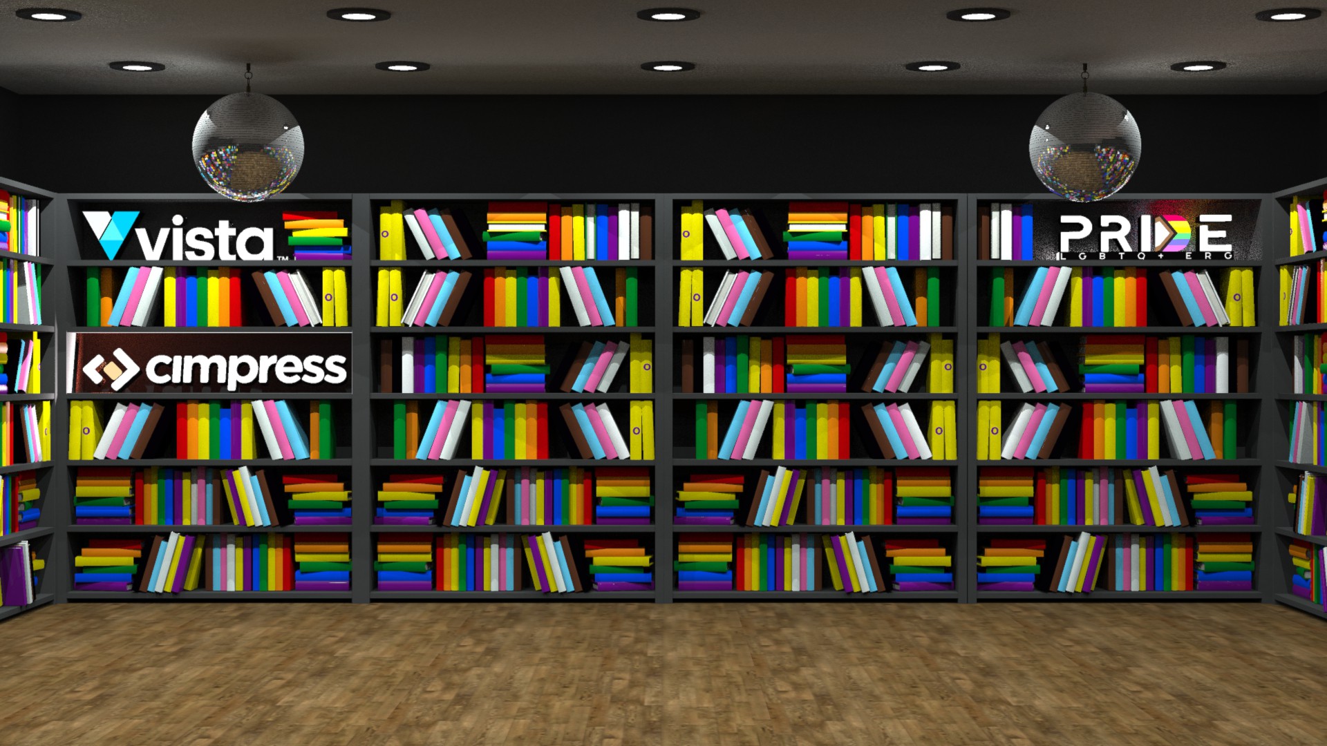 Zoom background featuring books in the colours and shapes of the Pride flag